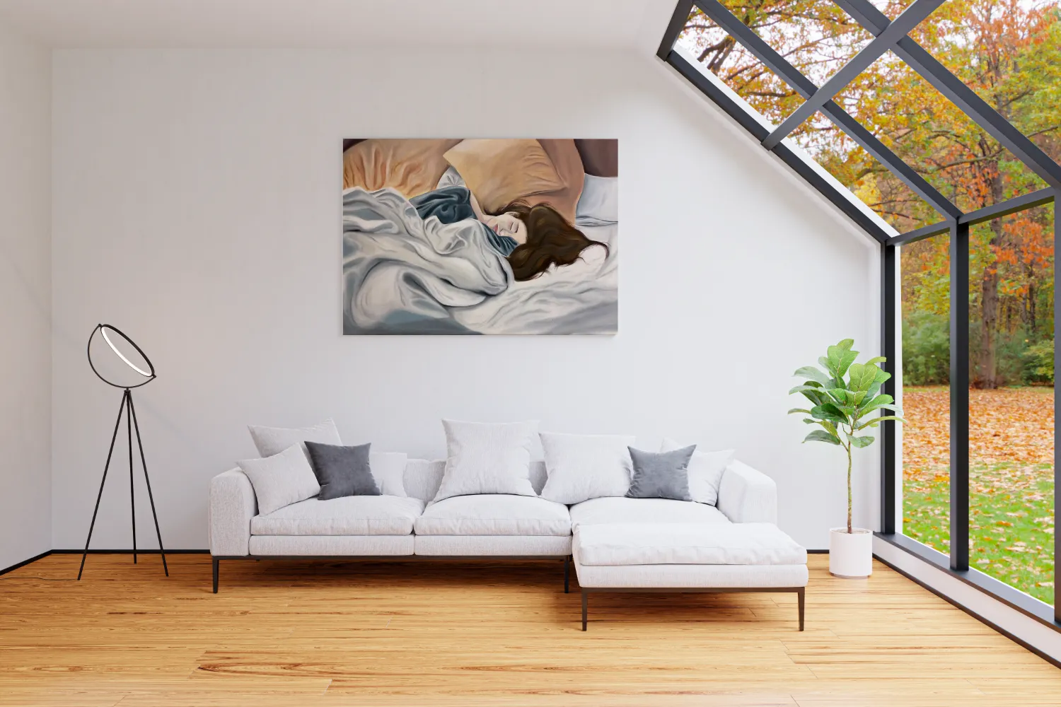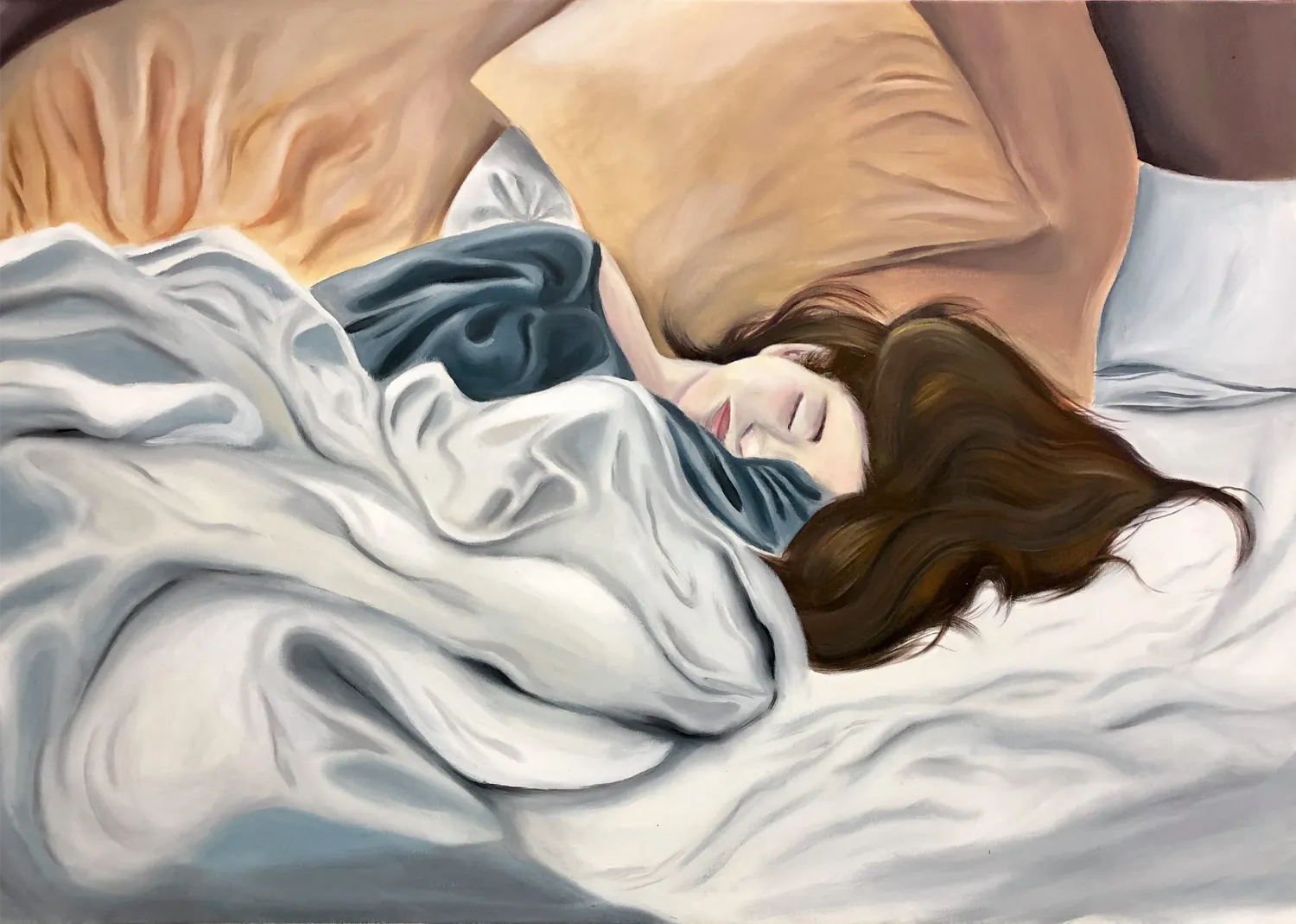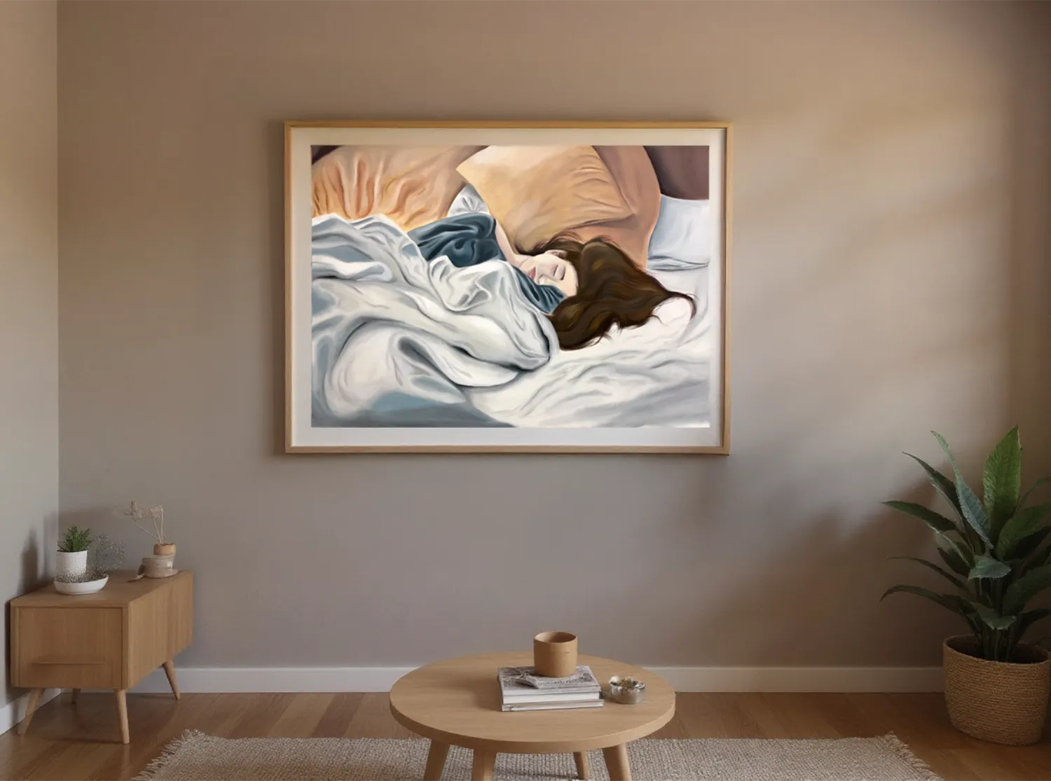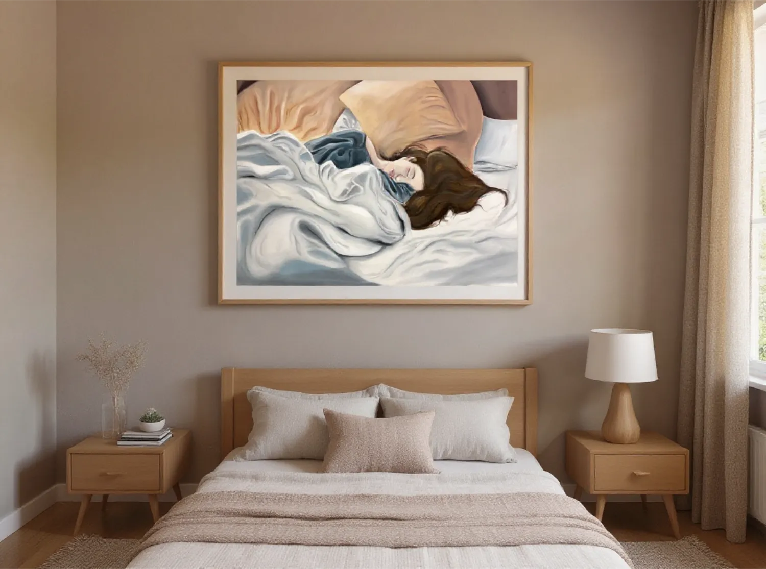 A serene and intimate portrayal of a young woman peacefully sleeping, surrounded by soft pillows and flowing blankets. Gentle brushstrokes and a soothing color palette of warm beiges, deep blues, and soft whites capture the quiet comfort of rest. This artwork invites a sense of calm and tenderness, making it a perfect centerpiece for a bedroom, living room, or relaxation space.