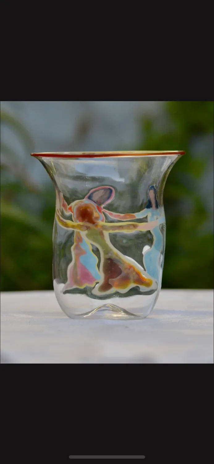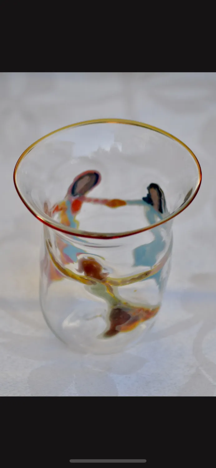 An original hand blown glass with dancing figures drawn on it, glass on glass!  Original artwork by master glassblower Sheva Chaya with the spirit and light of Tzfat.  Approximate size 3-4″ tall 6-8 ounces