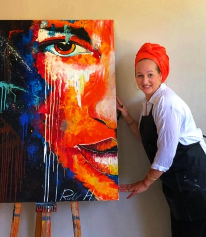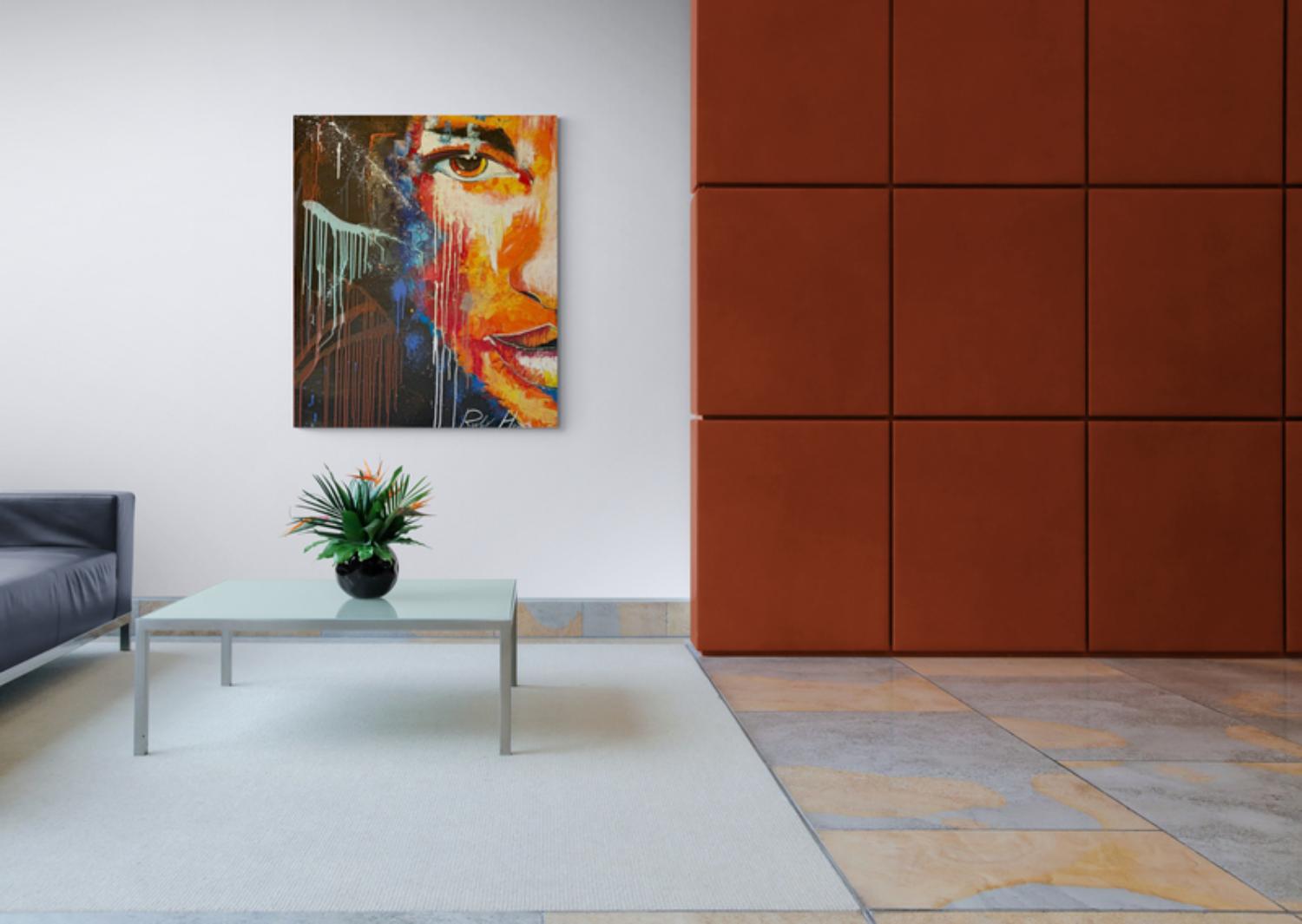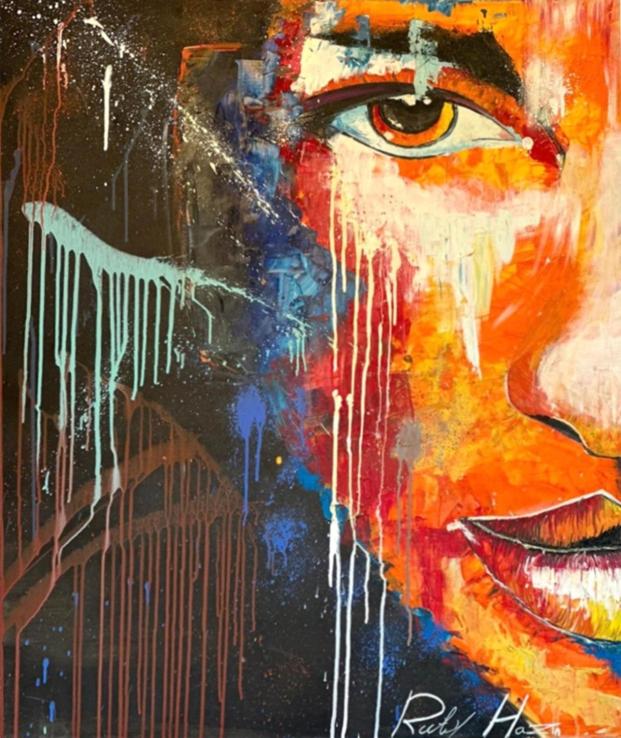 The painting features large half-faces with warm shades of orange and strong red, conveying inner strength and courage. The eyes express a powerful gaze, as if they carry the entire world of the viewer and stir their heart. The expression on the face presents the figure with intensity, as someone ready to face any challenge in their path. On the side of the painting, drips and splashes of color burst out wildly, representing strong inner movement and a pursuit of freedom, evoking a deep sense of emotion and power.