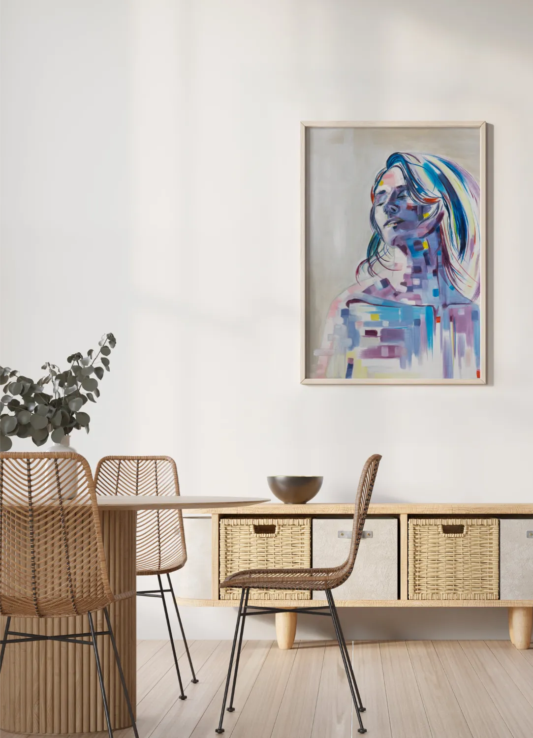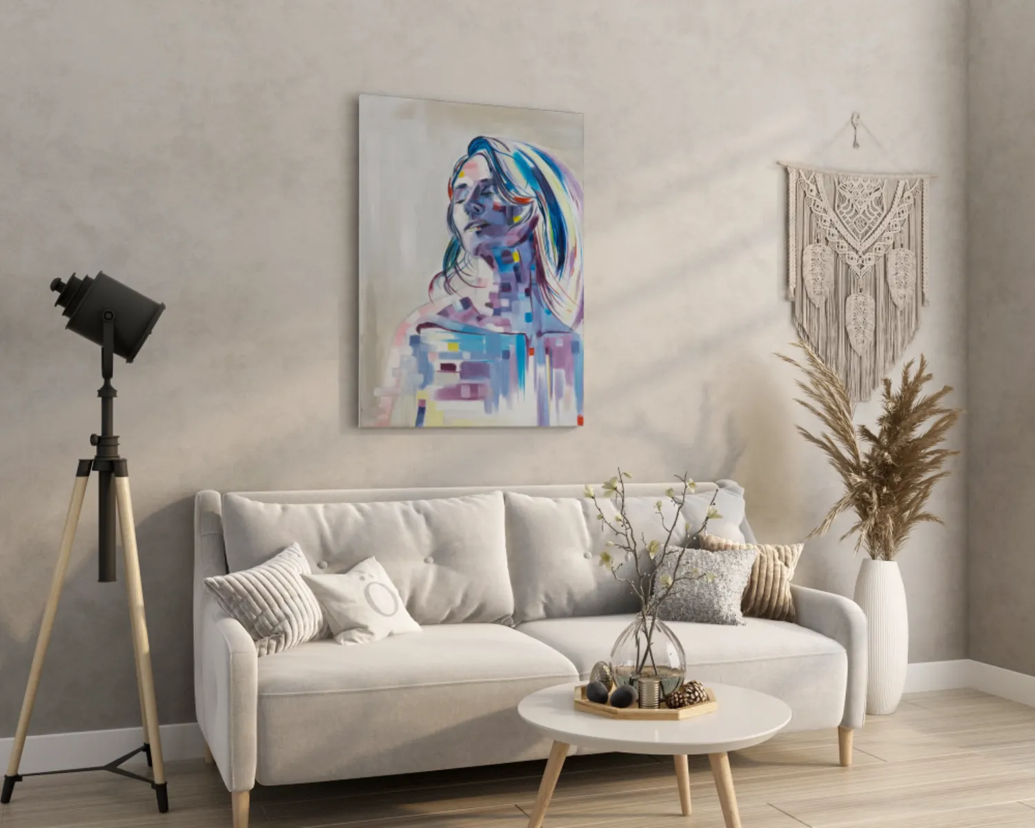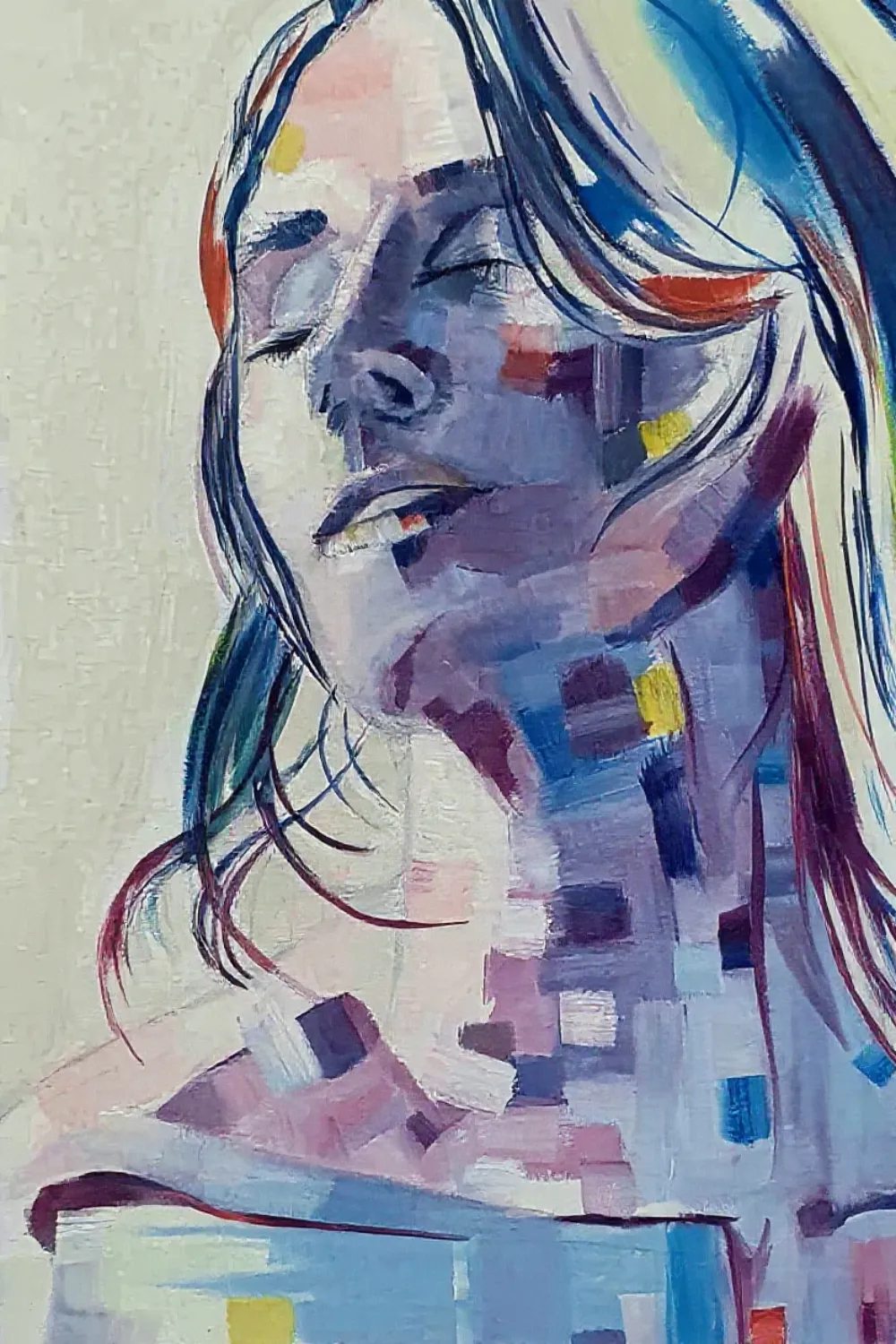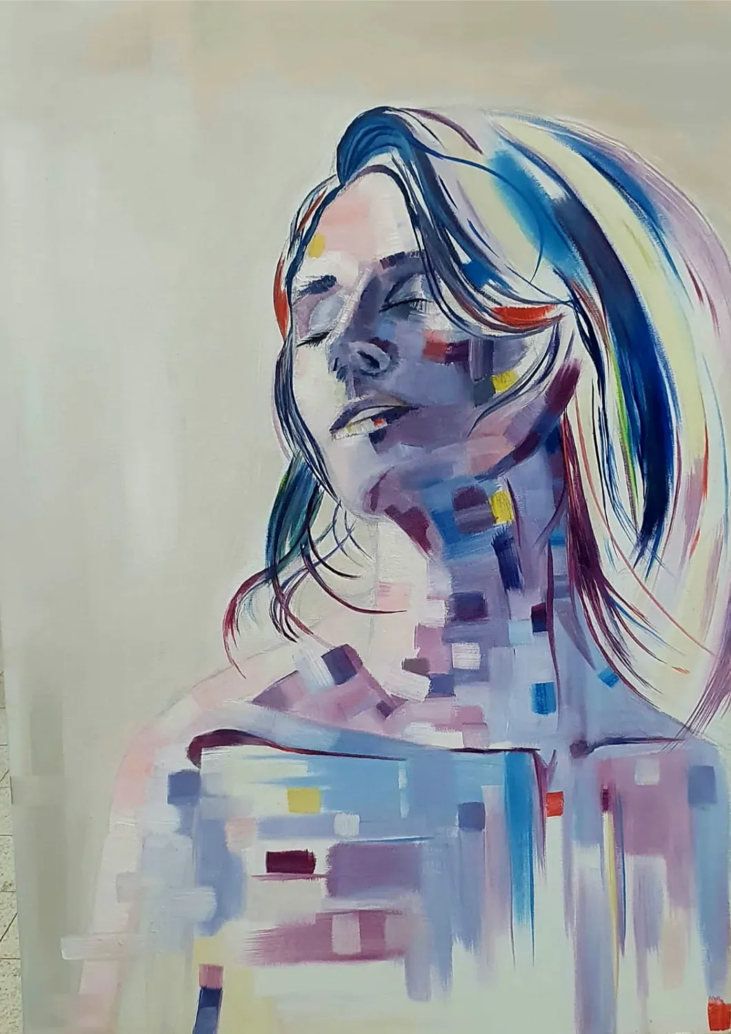 An expressive and modern portrait of a woman with closed eyes, captured in a moment of peace. The face and body are painted in soft purples, blues, and pinks, interwoven with abstract, pixel-like color blocks that create a dynamic fusion of realism and abstraction. This artwork evokes both calmness and vibrant energy, making it a captivating focal point for any interior.