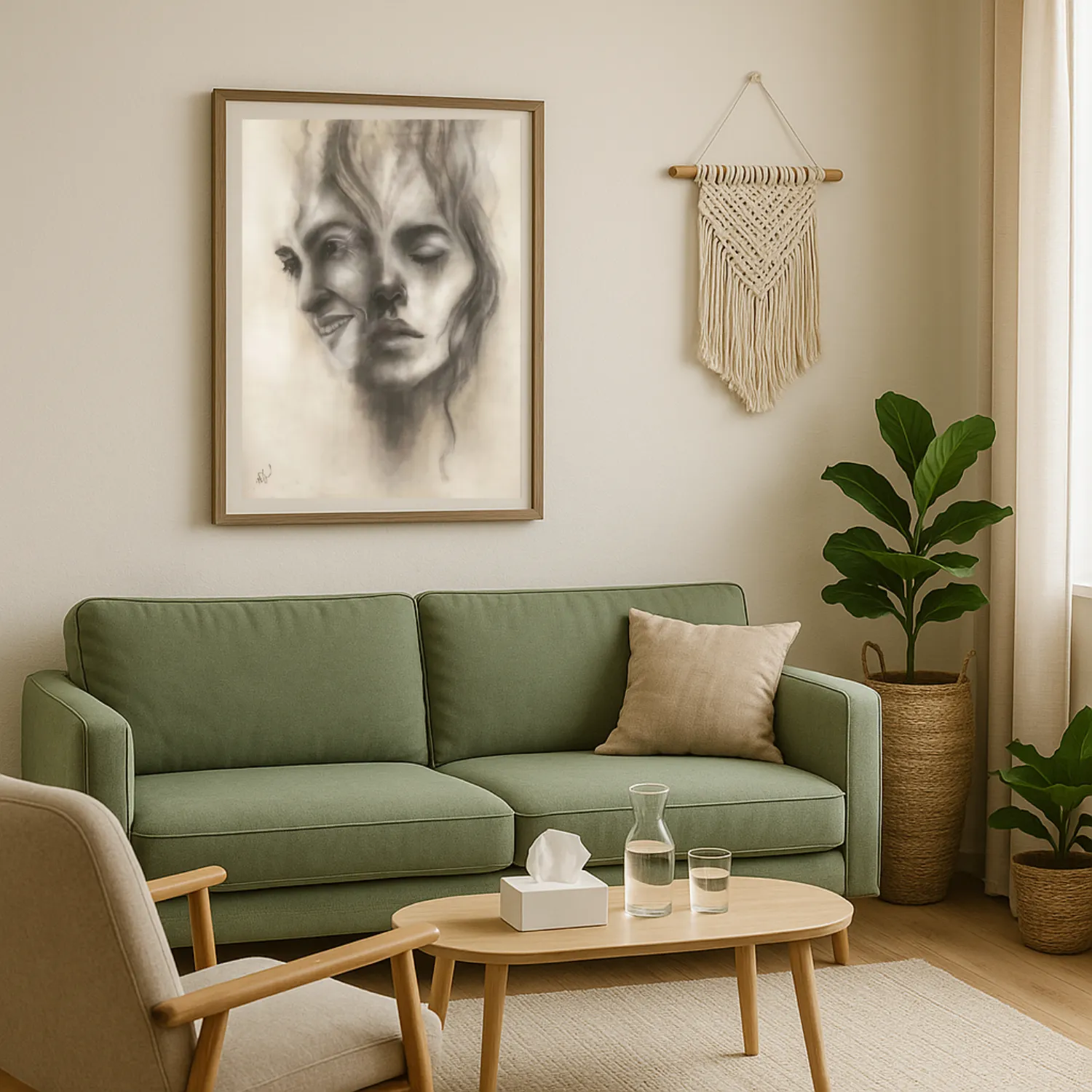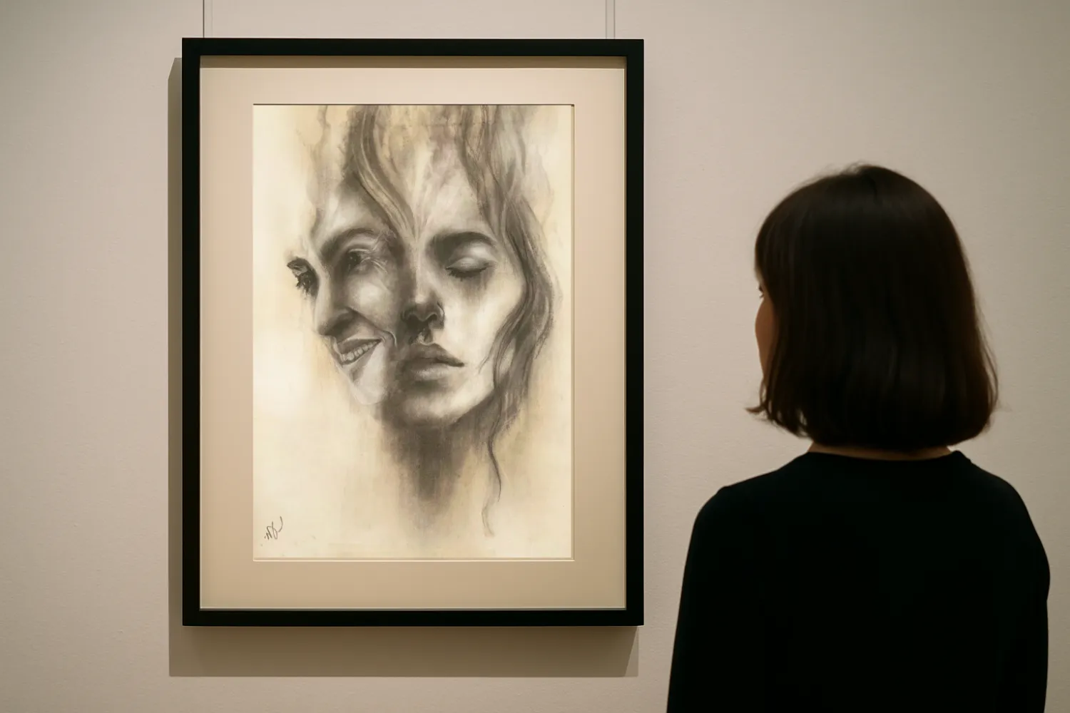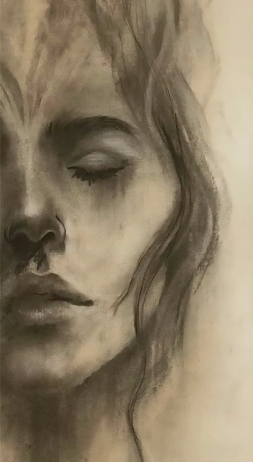 The charcoal technique reveals soft, delicate lines alongside dramatic shading, highlighting the constant shifts between emotions. Precision meets freedom of expression, resulting in a piece with emotional depth and an almost lifelike presence.