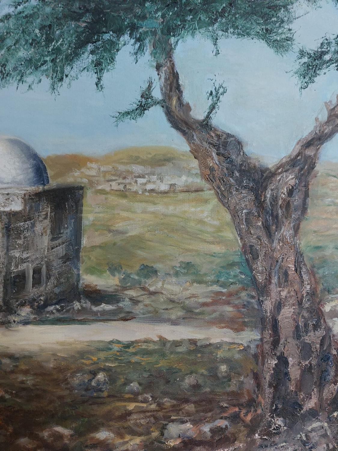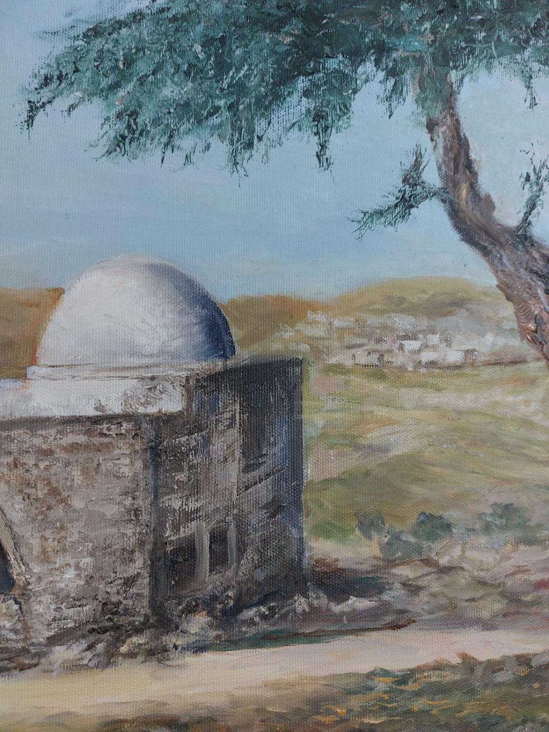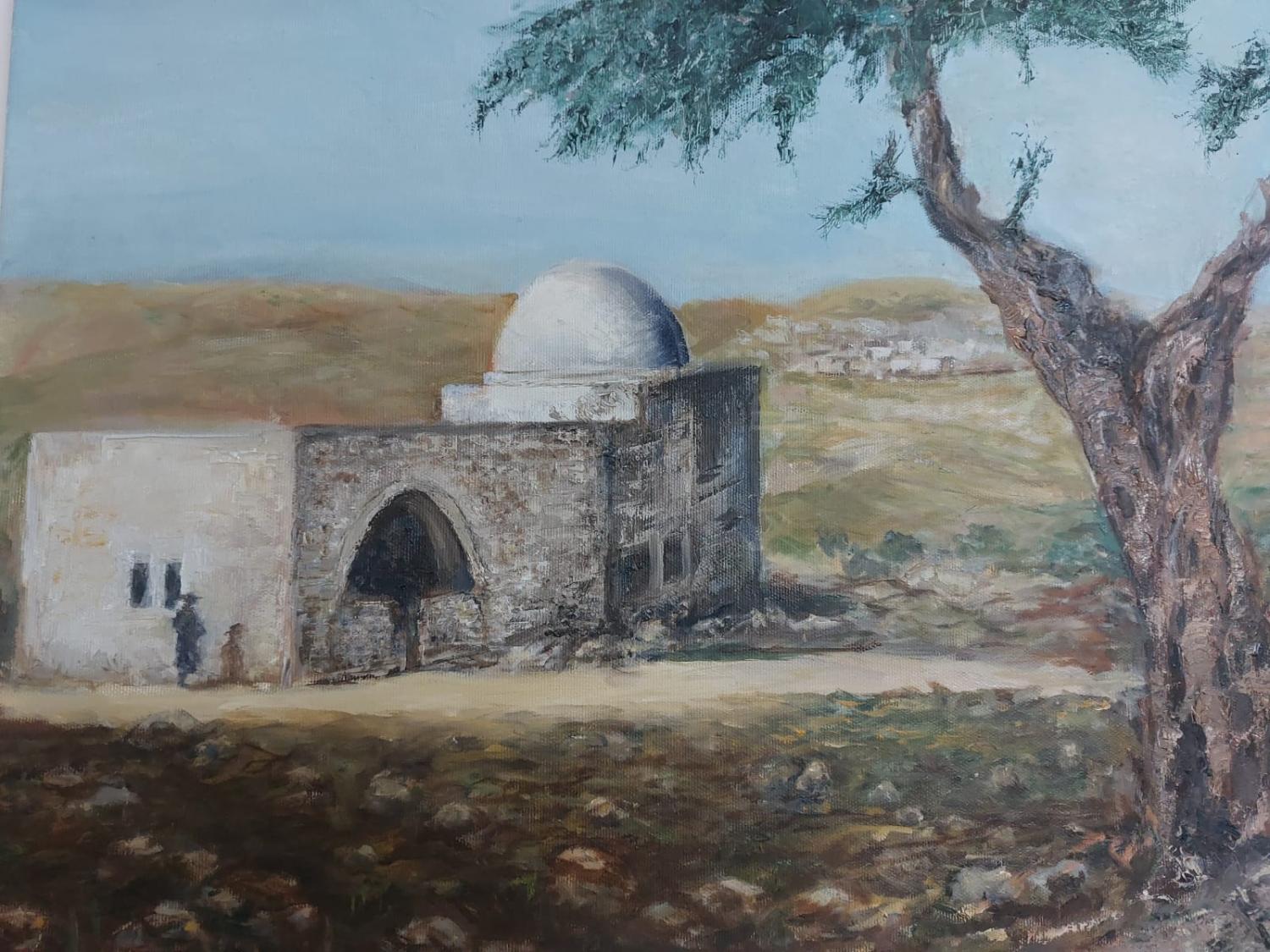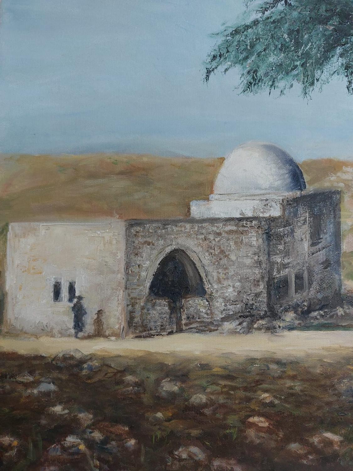 This painting captures the early, simple appearance of Rachel’s Tomb, set in an isolated, rugged landscape with minimal structures. The serene surroundings emphasize the sacredness and humility of this important site.