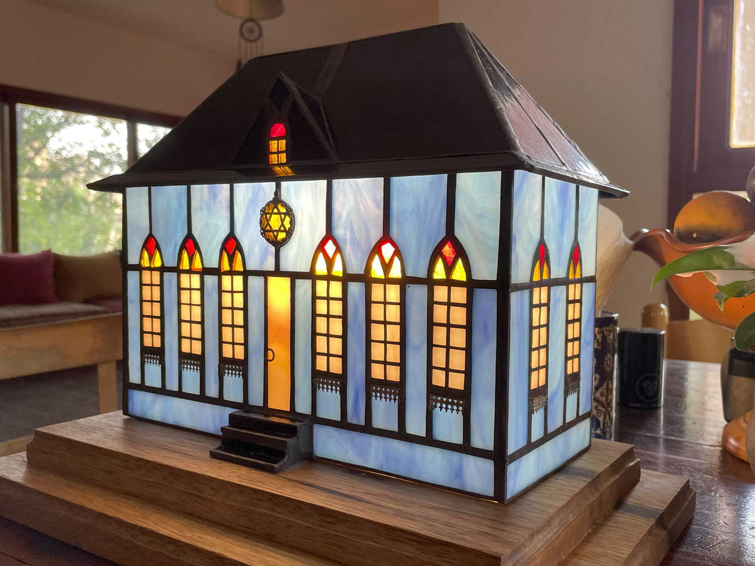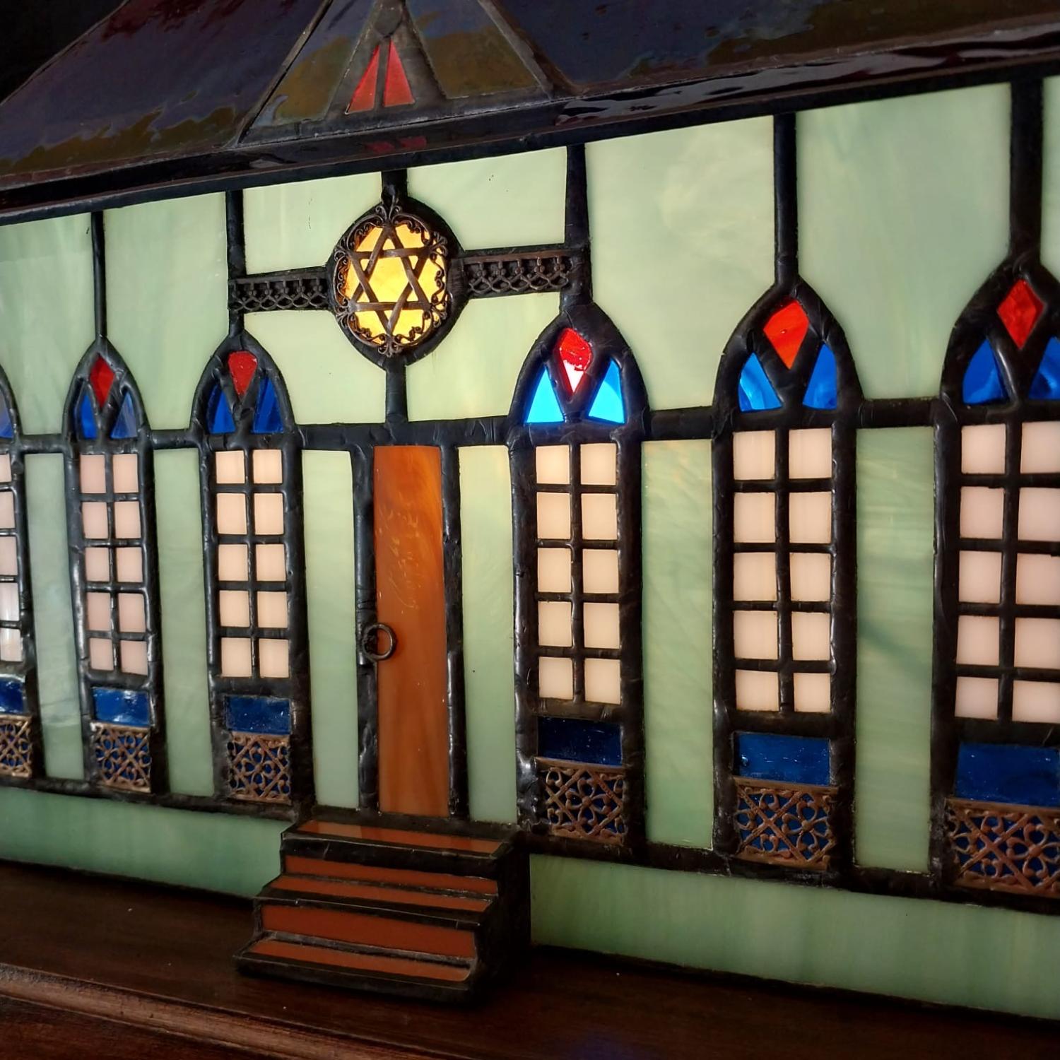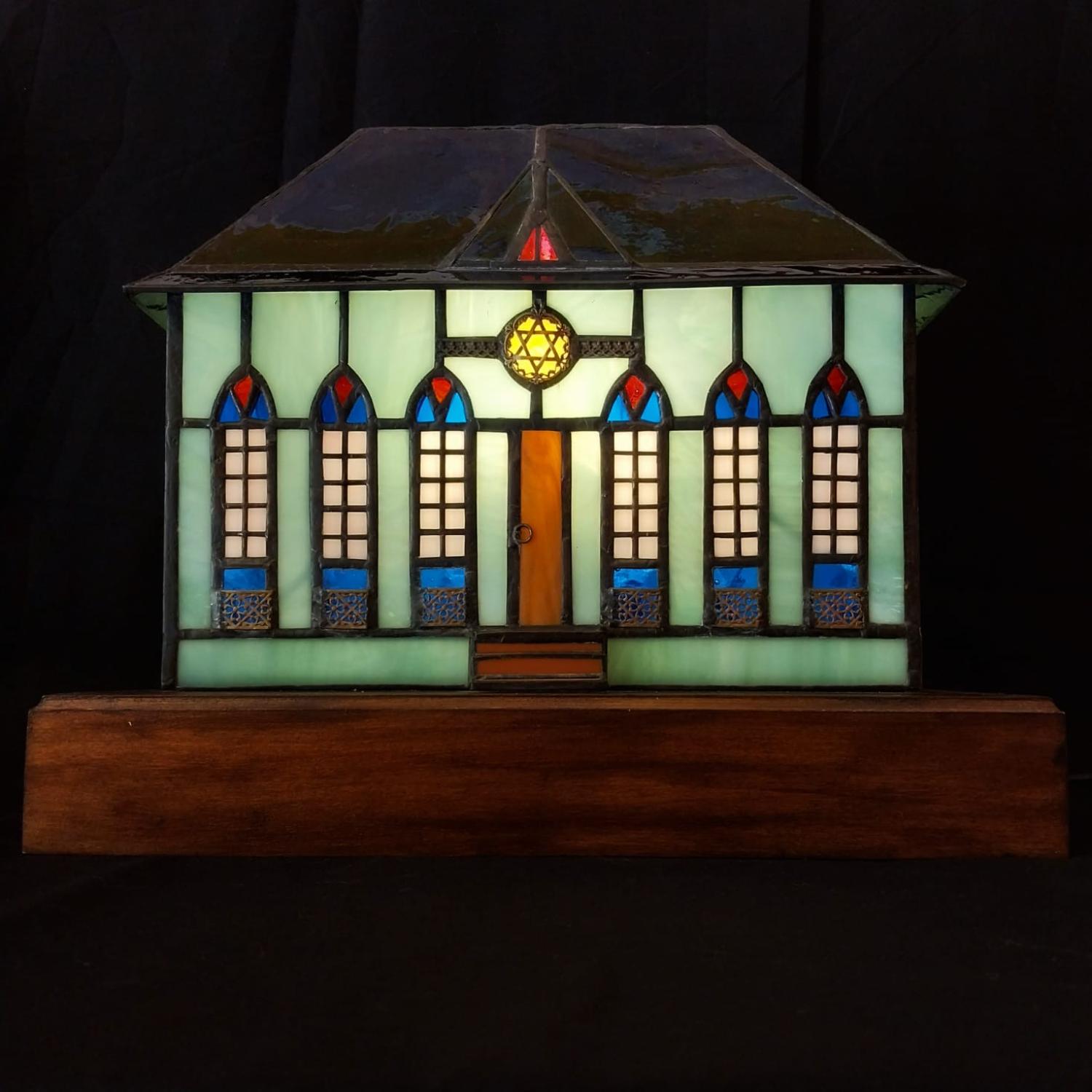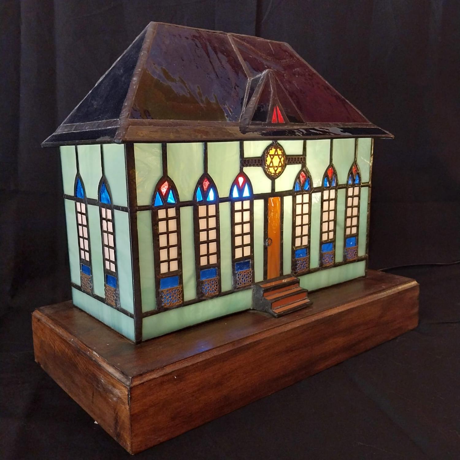 Stained glass with silver, brass, wooden base, electric cable, bulb