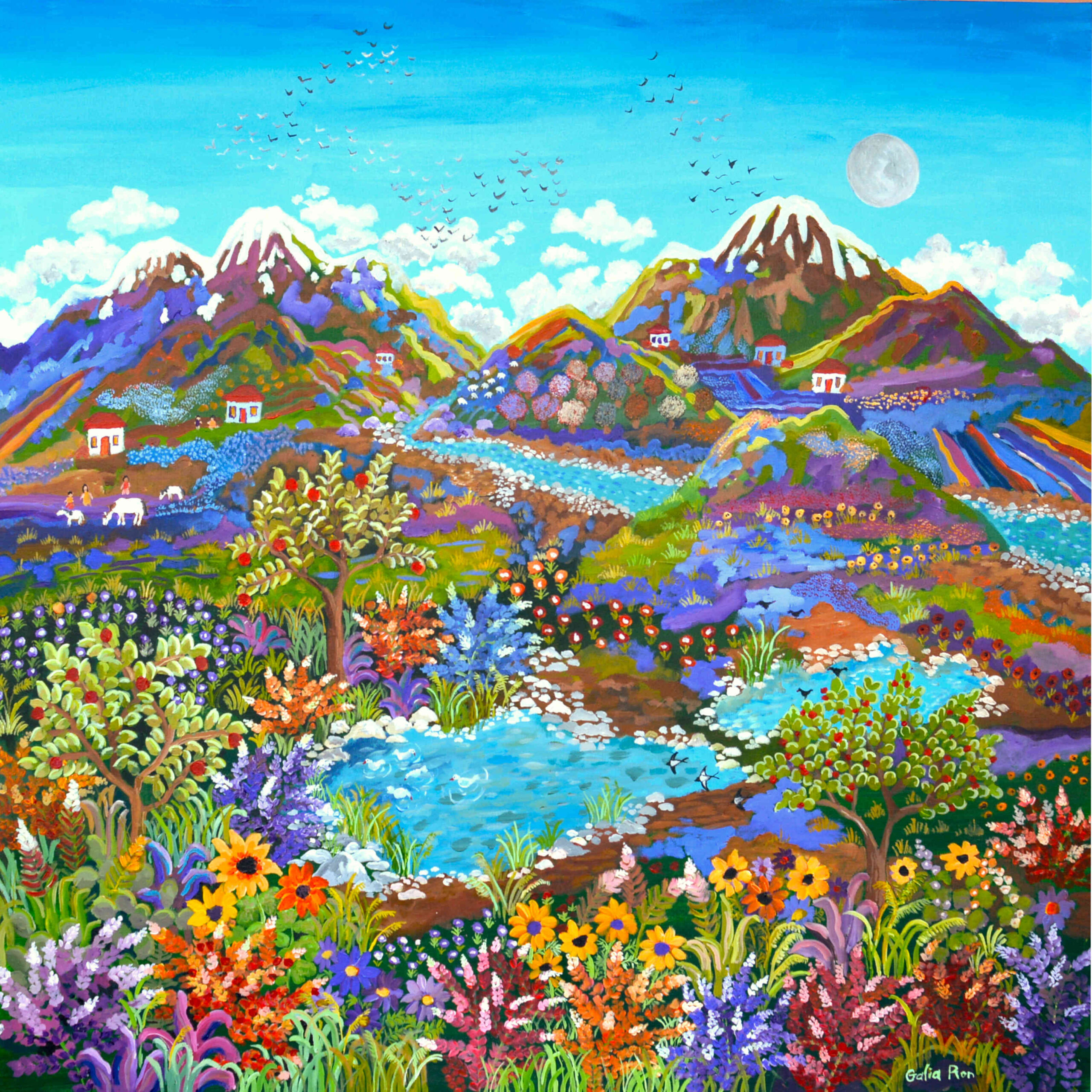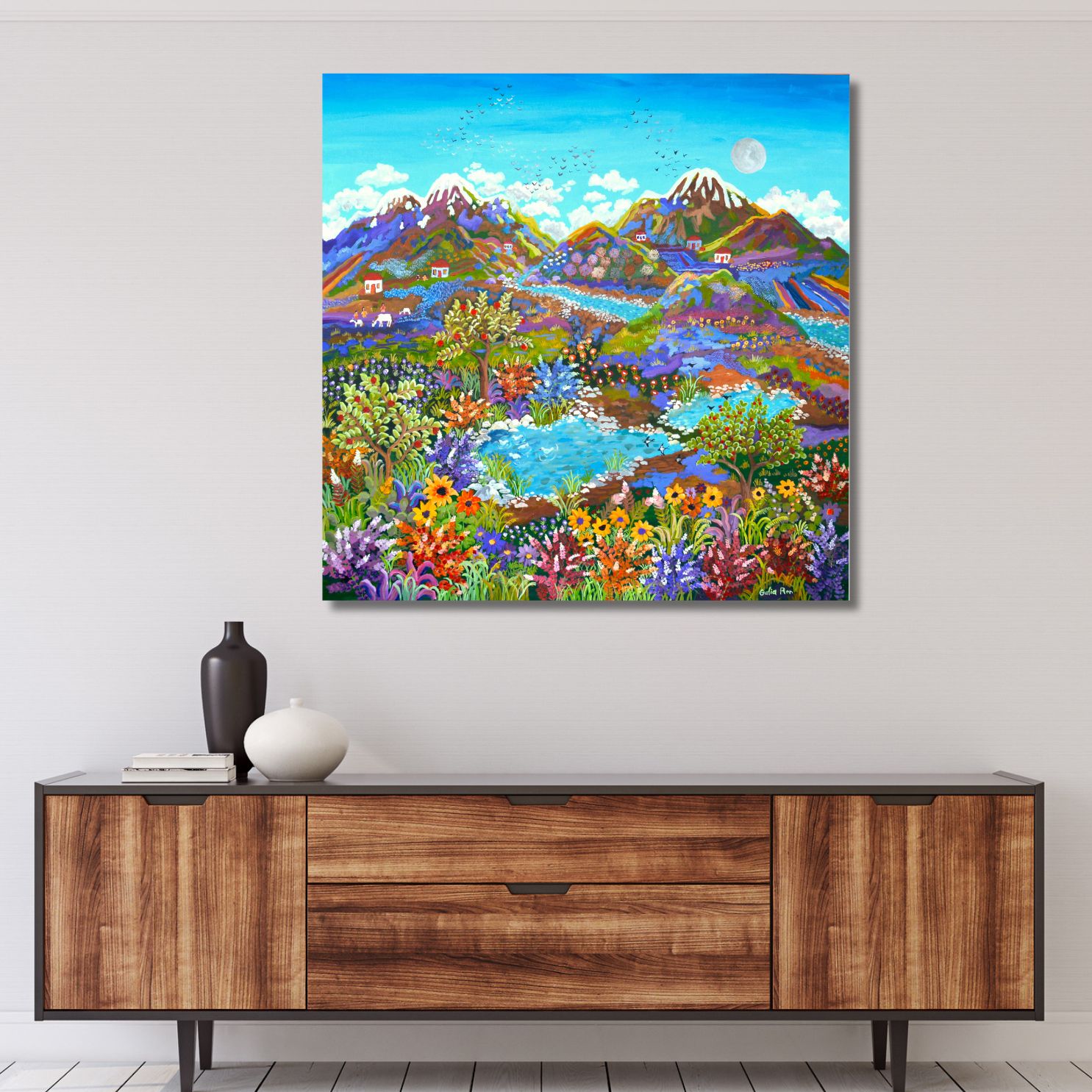 The Village at the Foot of the Snowy Mountain is an Original Acrylic Painting on Canvas.